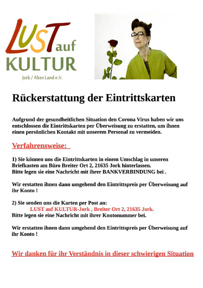 Leider gibt es derzeit viele Absagen von Veranstaltungen, um so mehr freut sich LUST auf KULTUR Jork das sich anstelle der traditionellen Kulturwoche in Jork wenigstens an 2 Tagen die "Jorker